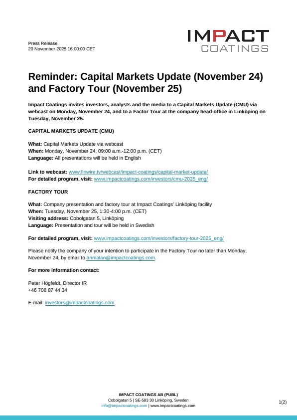 What: Capital Markets Update (CMU) via webcast Time: Monday November 24, 09:00 a.m.-12:00 p.m. (CET) Link to webcast: https://www.finwire.tv/webcast/impact-coatings/capital-market-update/