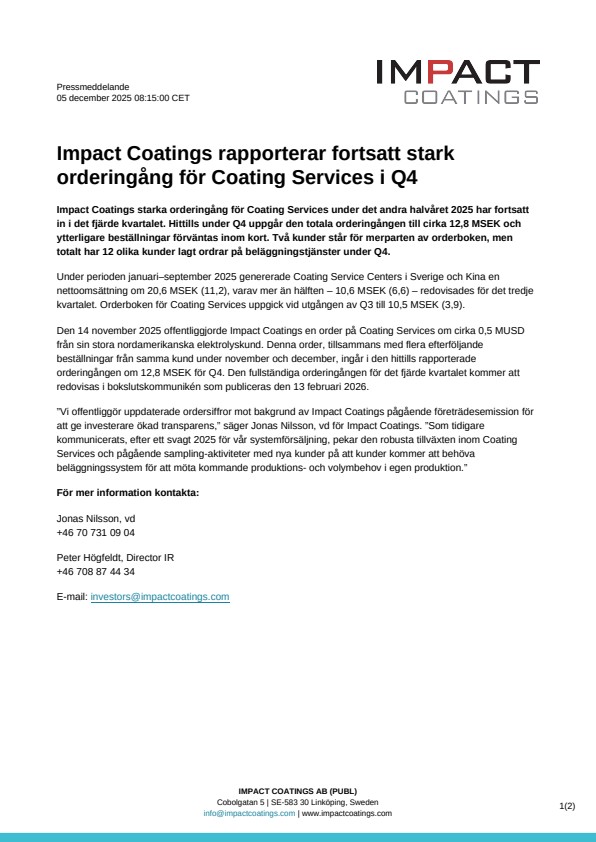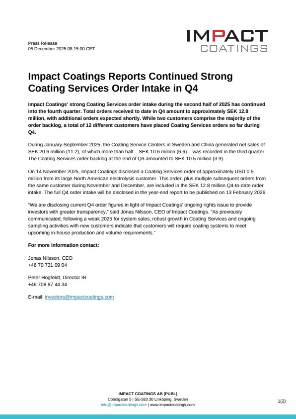 Den 14 november 2025 offentliggjorde Impact Coatings en order på Coating Services om cirka 0,5 MUSD från sin stora nordamerikanska elektrolyskund. Denna order, tillsammans med flera efterföljande beställningar från samma kund under november och december, ingår i den hittills rapporterade orderingången om 12,8 MSEK för Q4. Den fullständiga orderingången för det fjärde kvartalet kommer att redovisas i bokslutskommunikén som publiceras den 13 februari 2026.