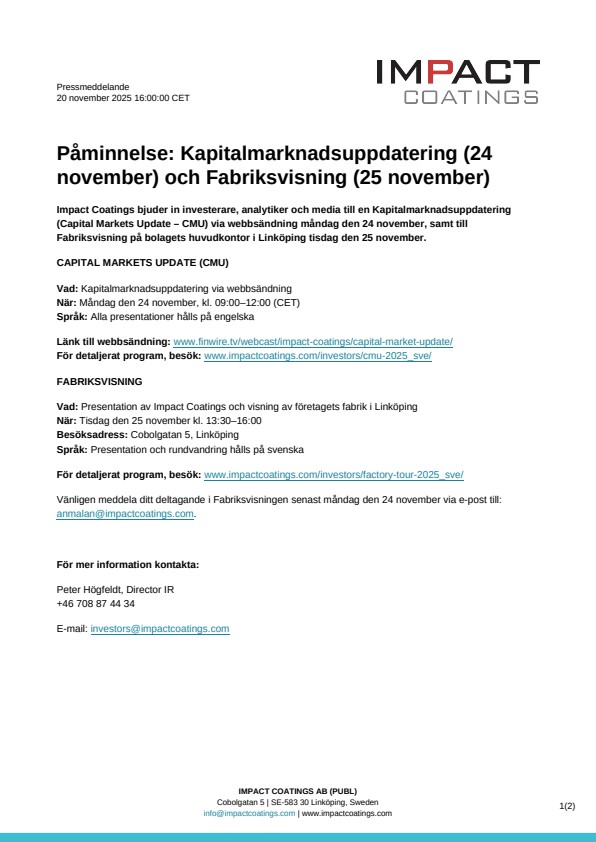 Vad: Kapitalmarknadsuppdatering (CMU) via webbsändningTid: Måndag den 24 november, kl. 09:00–12:00 (CET)Länk till webbsändning: https://www.finwire.tv/webcast/impact-coatings/capital-market-update/