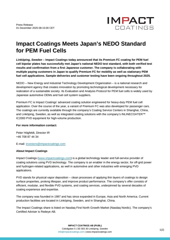 Linköping, Sweden – Impact Coatings today announced that its Premium FC coating for PEM fuel cell bipolar plates has successfully met Japan’s national NEDO test standard, with both verified test results and confirmation from a first Japanese customer. The company is collaborating with multiple paying customers in Japan to qualify Premium FC for mobility as well as stationary PEM fuel cell applications. Sample deliveries and customer testing have been ongoing throughout 2025.