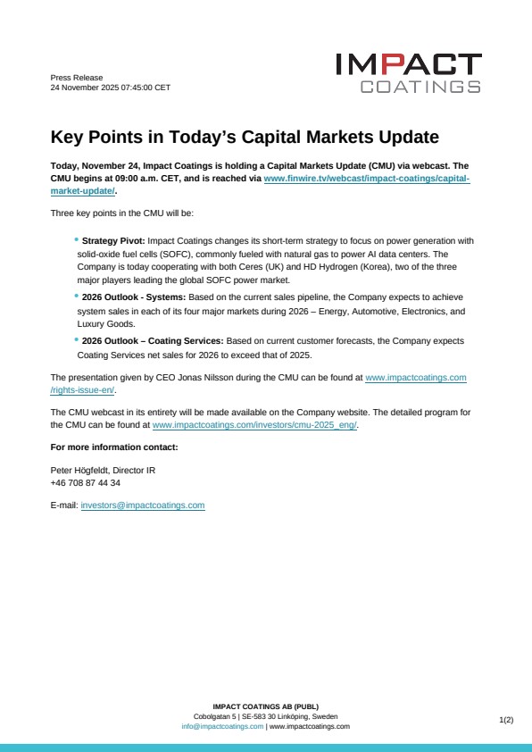 Today, November 24, Impact Coatings is holding a Capital Markets Update (CMU) via webcast. The CMU begins at 09:00 a.m. CET, and is reached via www.finwire.tv/webcast/impact-coatings/capital-market-update/.