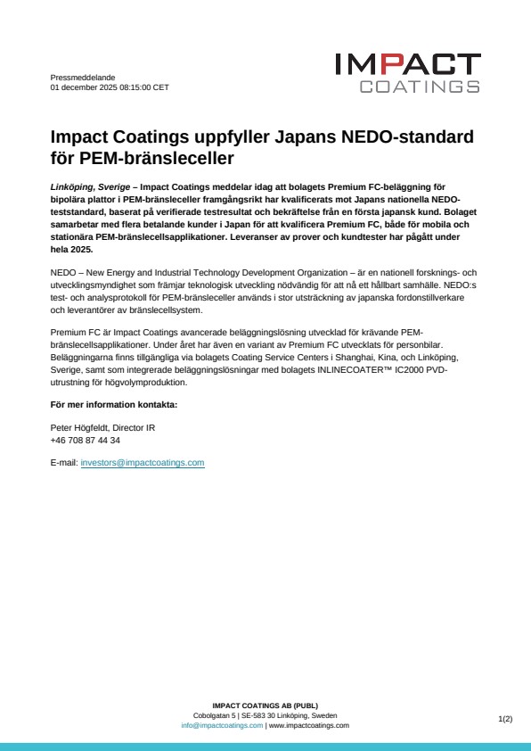 Linköping, Sverige – Impact Coatings meddelar idag att bolagets Premium FC-beläggning för bipolära plattor i PEM-bränsleceller framgångsrikt har kvalificerats mot Japans nationella NEDO-teststandard, baserat på verifierade testresultat och bekräftelse från en första japansk kund. Bolaget samarbetar med flera betalande kunder i Japan för att kvalificera Premium FC, både för mobila och stationära PEM-bränslecellsapplikationer. Leveranser av prover och kundtester har pågått under hela 2025.