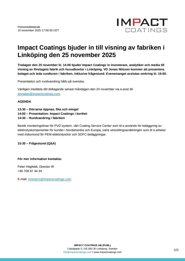 Tisdagen den 25 november kl. 14:00 bjuder Impact Coatings in investerare, analytiker och media till visning av företagets fabrik och huvudkontor i Linköping. VD Jonas Nilsson kommer att presentera bolaget och leda rundturen i fabriken, inklusive frågestund. Evenemanget avslutas omkring kl. 16:00.