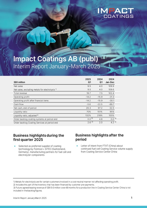 Coating Services continued its positive trend over the year, although revenues remain at lower levels compared to 12 months ago due to delayed orders in electrolysis, as previously communicated. Net sales from Coating Services amounted to SEK 6.6 million (8.4) for the quarter, excluding metals for electrolysis, primarily driven by Coating Service Center China, which remains in full operation.