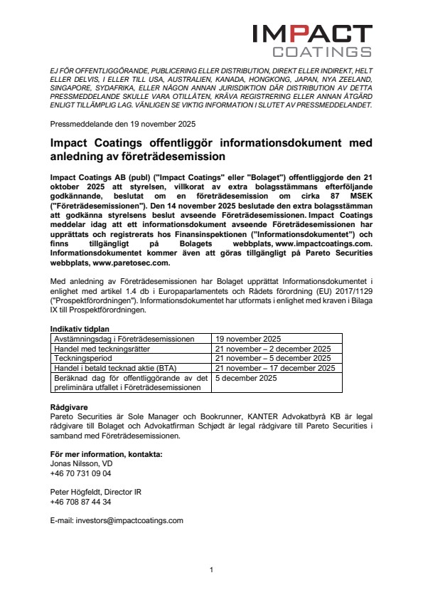 Impact Coatings AB (publ) (“Impact Coatings” eller “Bolaget”) offentliggjorde den 21 oktober 2025 att styrelsen, villkorat av extra bolagsstämmans efterföljande godkännande, beslutat om en företrädesemission om cirka 87 MSEK (“Företrädesemissionen”). Den 14 november 2025 beslutade den extra bolagsstämman att godkänna styrelsens beslut avseende Företrädesemissionen. Impact Coatings meddelar idag att ett informationsdokument avseende Företrädesemissionen har upprättats och registrerats hos Finansinspektionen (”Informationsdokumentet”) och finns tillgängligt på Bolagets webbplats, www.impactcoatings.com. Informationsdokumentet kommer även att göras tillgängligt på Pareto Securities webbplats, www.paretosec.com. Med anledning av Företrädesemissionen har Bolaget upprättat Informationsdokumentet i enlighet med artikel 1.4 db i Europaparlamentets och Rådets förordning (EU) 2017/1129 (“Prospektförordningen“). Informationsdokumentet har utformats i enlighet med kraven i Bilaga IX till Prospektförordningen. Indikativ tidplan