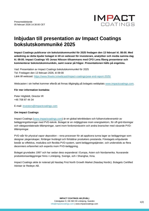What: Presentation of Impact Coatings’ Year-End Report 2025Time: Friday February 13, 2026, at 09:00 a.m. (CET)Link to webcast: https://www.finwire.tv/webcast/impact-coatings/year-end-report-2025/ The webcast in its entirety will afterwards be available on the company’s website www.impactcoatings.com.