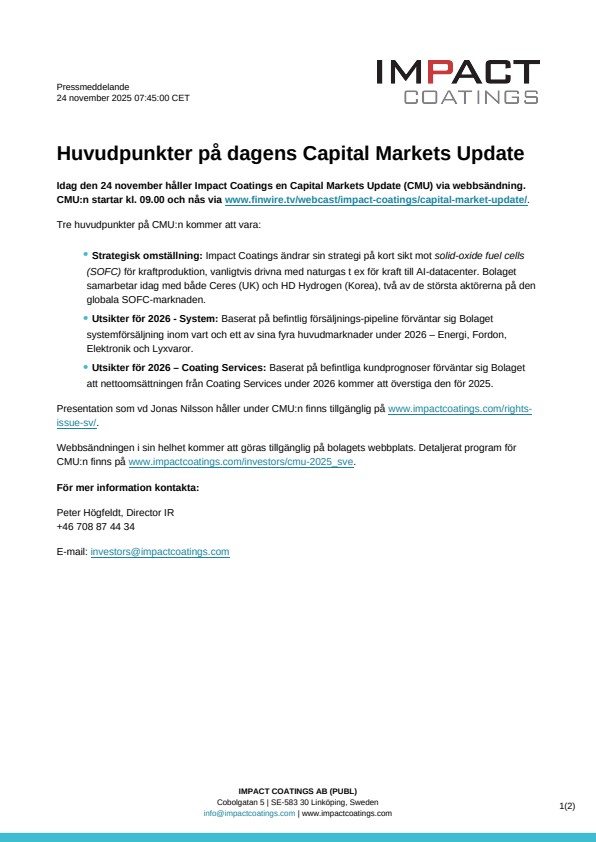 Today, November 24, Impact Coatings is holding a Capital Markets Update (CMU) via webcast. The CMU begins at 09:00 a.m. CET, and is reached via www.finwire.tv/webcast/impact-coatings/capital-market-update/.