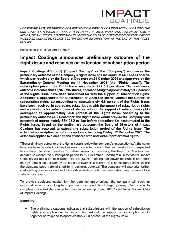 Impact Coatings AB (publ) (“Impact Coatings” or the “Company”) announces the preliminary outcome of the Company’s rights issue of a maximum of 58,324,474 shares, which was resolved by the Board of Directors on 21 October 2025 and approved by the Extraordinary General Meeting on 14 November 2025 (the “Rights Issue”). The subscription price in the Rights Issue amounts to SEK 1.5 per share. The preliminary outcome indicates that 13,943,796 shares, corresponding to approximately 23.9 percent of the Rights Issue, have been subscribed for with the support of subscription rights. Additionally, applications for subscription of 2,829,515 shares without the support of subscription rights, corresponding to approximately 4.9 percent of the Rights Issue, have been received. In aggregate, subscriptions with the support of subscription rights and applications for subscription of shares without the support of subscription rights correspond to approximately 28.8 percent of the Rights Issue. According to the preliminary outcome on 5 December, the Rights Issue would provide the Company with proceeds of approximately SEK 25.2 million before deductions for costs related to the Rights Issue. Based on the preliminary outcome, the Board of Directors of Impact Coatings has resolved to extend the subscription period of the Rights Issue. The extended subscription period runs up to and including Friday, 12 December 2025. The extension applies to subscriptions of shares with and without preferential rights.