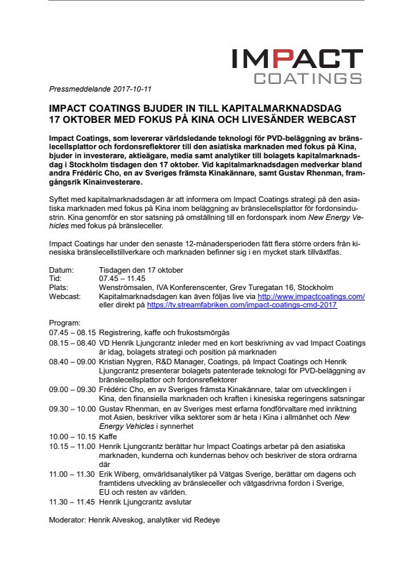 Syftet med kapitalmarknadsdagen är att informera om Impact Coatings strategi på den asiatiska marknaden med fokus på Kina inom beläggning av bränslecellsplattor för fordonsindustrin. Kina genomför en stor satsning på omställning till en fordonspark inom New Energy Vehicles med fokus på bränsleceller.