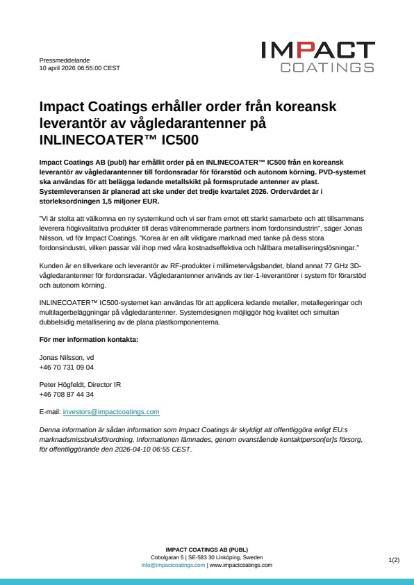 Impact Coatings AB (publ) har erhållit order på en INLINECOATER™ IC500 från en koreansk leverantör av vågledarantenner till fordonsradar för förarstöd och autonom körning. PVD-systemet ska användas för att belägga ledande metallskikt på formsprutade antenner av plast. Systemleveransen är planerad att ske under det tredje kvartalet 2026. Ordervärdet är i storleksordningen 1,5 miljoner EUR.