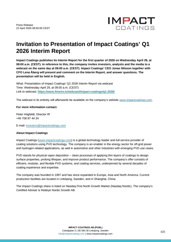 What: Presentation of Impact Coatings’ Q1 2026 Interim Report via webcastTime: Wednesday April 29, at 09:00 a.m. (CEST)Link to webcast: https://www.finwire.tv/webcast/impact-coatings/q1-2026/ The webcast in its entirety will afterwards be available on the company’s website www.impactcoatings.com.