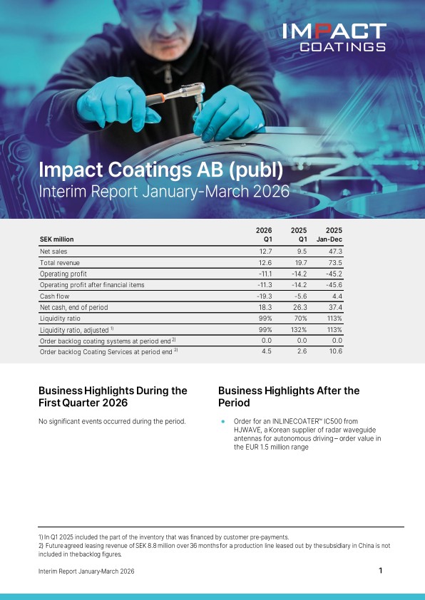 Stable Q1 – system order after the end of the quarterNet sales during the first quarter amounted to SEK 12.7 million (9.5). As in previous years, the business was affected by seasonal effects linked to the Chinese New Year, which temporarily reduced activity in China. We also experienced some delay in Coating Services order intake, which affected net sales. This was compensated for by a positive one-off effect of SEK 4.8 million. The one-off effect is a consequence of the sale of metals in inventory to accelerate the transition to the new metals management agreement previously communicated.